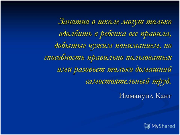 Домашние задания играют огромную роль в развитии самостоятельных учебных умений. Системная работа ученика дома приводит к тому, что процесс учения его не отягощает, он получает навыки поиска информации, учиться выполнять работу качественно и в срок.